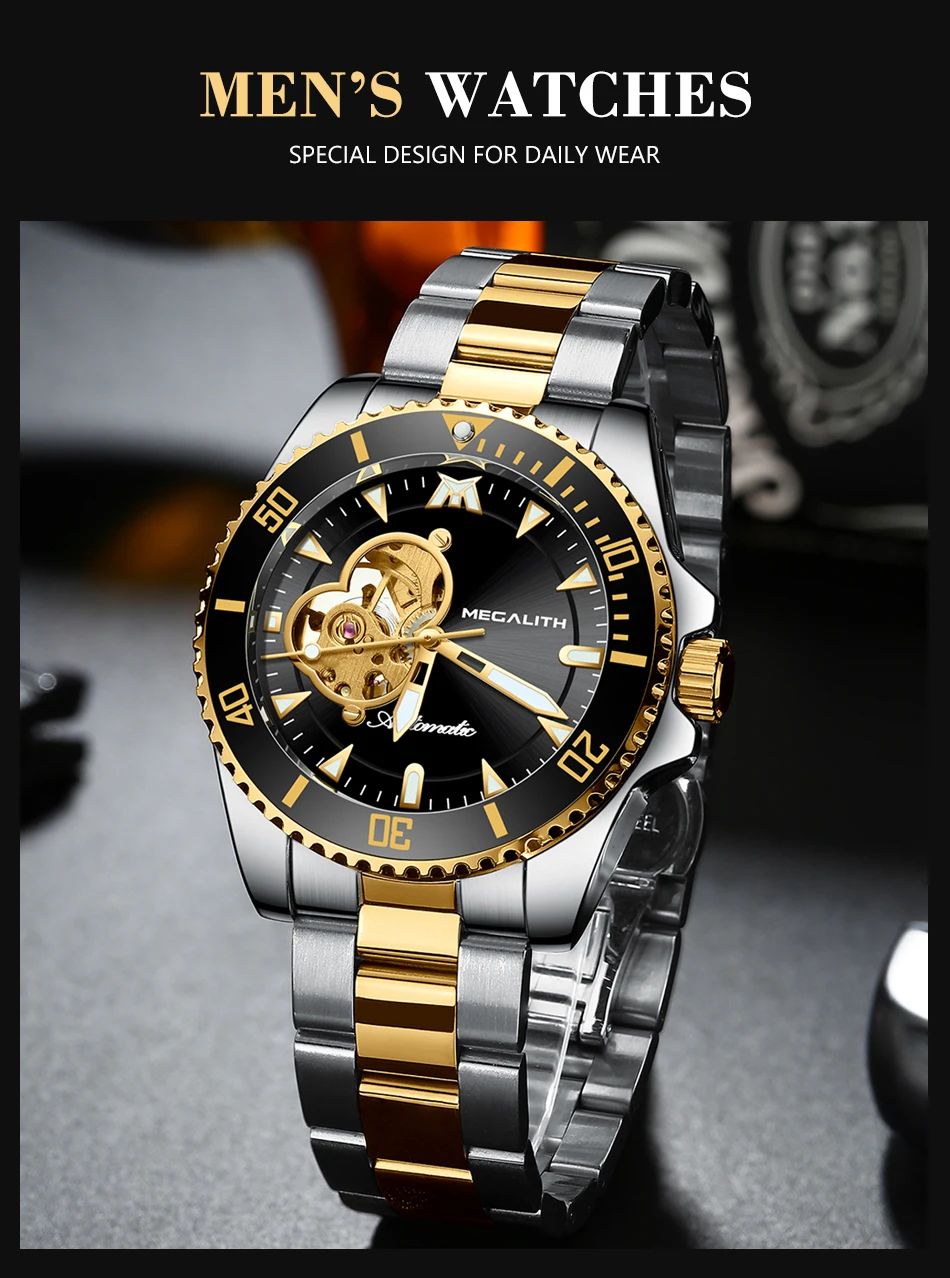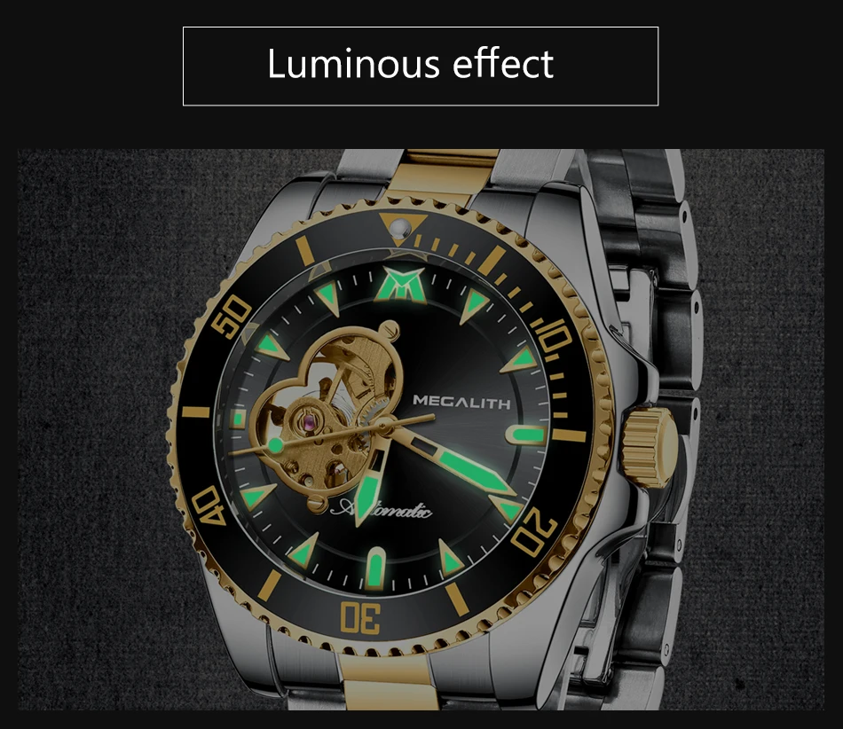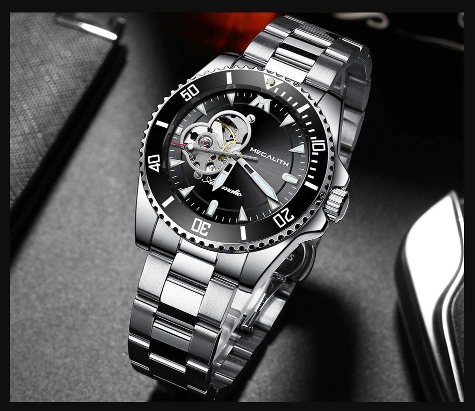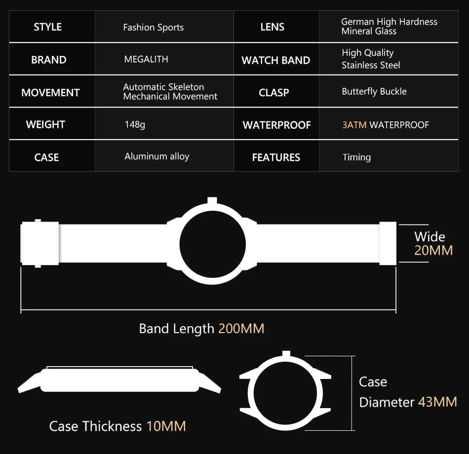 Особенности: Оригинальные часы MEGALITH 100% новые, с биркой и гарантией качества; Водонепроницаемость до 3 АТМ (вы можете использовать их под дождем или при мытье рук; не допускается использование в горячей води или при плавании) Идеально подходит для всех видов бизнеса, повседневного использования, спорта и занятий внутри помещения. Технические характеристики: Товар: Мужские механические часы Тип часов: механические часы/модные часы/мужские часы Световой, Водонепроницаемый Материал корпуса: Сплав Материал ремешка: Нержавеющая сталь Колебательная система: механические часы Параметры: Диаметр циферблата: 43 мм Толщина корпуса: 10 мм Длина Часов: 20 см Ширина ремешка: 20 мм Водонепроницаемость: до 3 бар Посылка включает в себя: 1 х часы Megalith 1 х ,оригинальная бархатная сумка для часов Megalith Руководство пользователя (1 шт.)