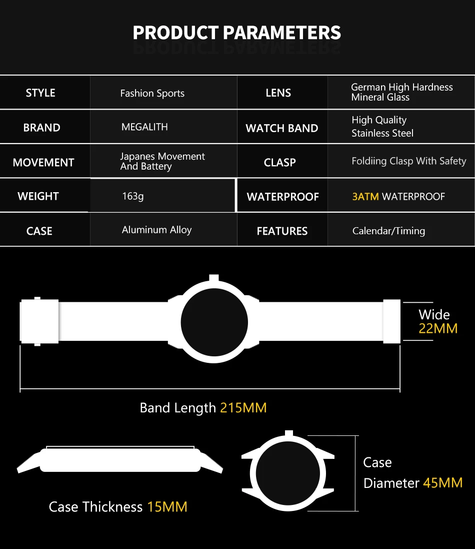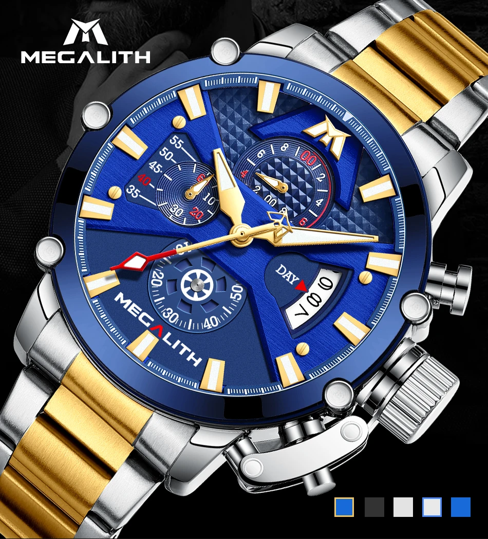 Megalith – бренд качественных мужских наручный часов. Часы комплектуются оригинальным японским кварцевым механизмом, хорошим минеральным стеклом, изготавливаются из особого сплава металлов. Процесс сборки сосредоточен на одном заводе, соответствующем требованиям международного стандарта качества ICO:9001. Эти часы изготовлены из высококачественного материала и имеют изысканный внешний вид, удобны для ношения. Часы выглядят модно и красиво. Стильный дизайн идеально подходит для повседневных дел, бизнеса, вечеринок, офисной работы. Высококачественный кварцевый механизм обеспечивает точное время.