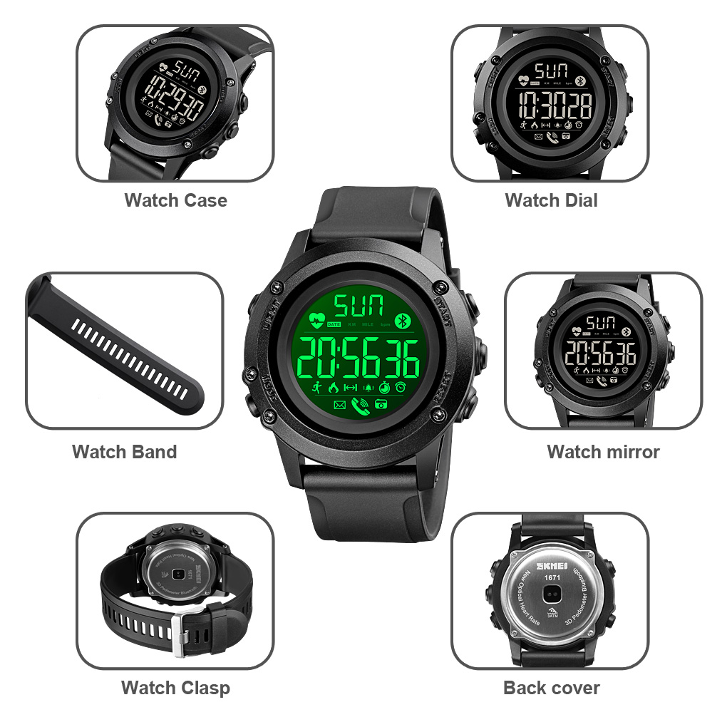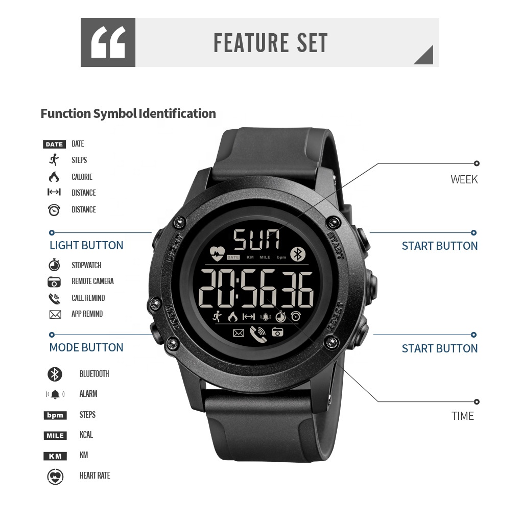 | Функции | Время, дни недели, дата, шагомер, счетчик каллорий, напоминание, приложения, режим сна, серцебиение, дистанция, удаленная камера, индикатор батареи, Bluetooth |