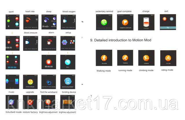 Запис тренувань: крок за рахунком, час тренування, витрата калорій в кілометрах, моніторинг сну, збереження 30 днів. упражнения Мульти-спортивный режим: бег, верховая езда, ходьба, фитнес Мониторинг здоровья: измерение частоты сердечных сокращений в режиме реального времени (динамическая статическая функция «Умное напоминание»: индивидуальный будильник для напоминания, напоминание о питьевой воде, сидячий напоминание, напоминание о вызове, отклонение вызова, информация push (SMS / QQ / WeChat / Skupe / Facebook / TwitterLine / WhatsApp) без потерь напоминание Другие функции: повернуть запястье к яркому экрану, физическое обследование в один клик, отображение времени, дистанционное управление для съемки, режим «не турбувати» настройка, пошук браслета, WeChat спортивний, перемикання по горизонталі Ntal і вертикальний екран, налаштувати стиль домашньої сторінки, браслет для відхилення дзвінків, підтримка оновлення повітря програми.