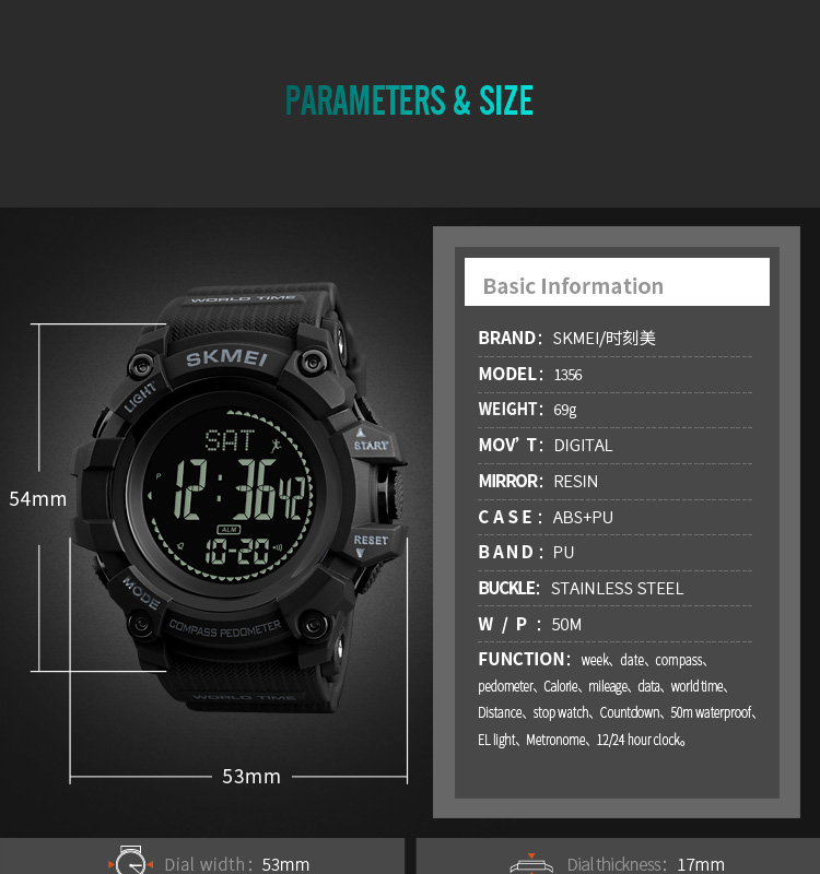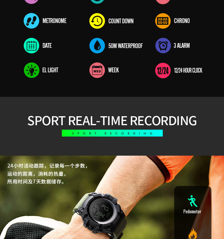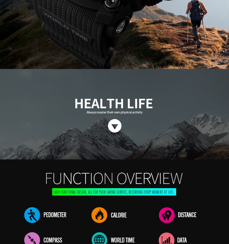 | Функції | Світовий час, дні тижня, дата, компас, крокомір, лічильник калорій, дистанція, зворотний відлік, метроном, EL підсвітка, 12/24 |