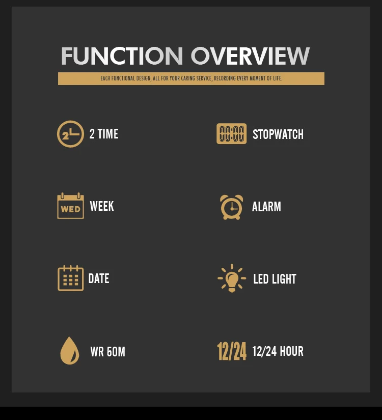 | Функції | Подвійний час, секундомір, будильник, дата, дні тижня, зворотний відлік, EL підсвітка, 12/24 |