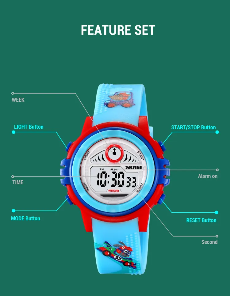 Годинник Skmei 2266RA Racing представляємо вам стильний та функціональний годинник Skmei 2266RA Racing, створений спеціально для дівчаток, які цінують активний спосіб життя. Цей спортивний аксесуар поєднує в собі різноманітність функцій і стильний дизайн. З водонепроникністю на глибині до 50 метрів і електронним механізмом, годинник ідеально підходить для занять спортом і повсякденного використання. Виготовлені з якісних матеріалів, як-от каучук для корпусу та метал для ремінця, вони забезпечують комфорт і надійність. Ця модель пропонує корисні функції, включно з будильником, календаром, другим годинниковим поясом і секундоміром, а також обладнана люмінесцентною підсвіткою для зручності в умовах низького освітлення. Кругла форма корпусу та яскравий блакитний колір нададуть вашому образу особливого стильного акценту. З розмірами корпусу 35 х 35 мм і вагою всього 55 г, Skmei 2266RA Racing стане чудовим доповненням вашого щоденного гардероба. Не проґавте можливість придбати цей чудовий аксесуар із гарантією на 12 місяців — насолоджуйтеся стильним виглядом і надійним супроводом у ваших пригодах!