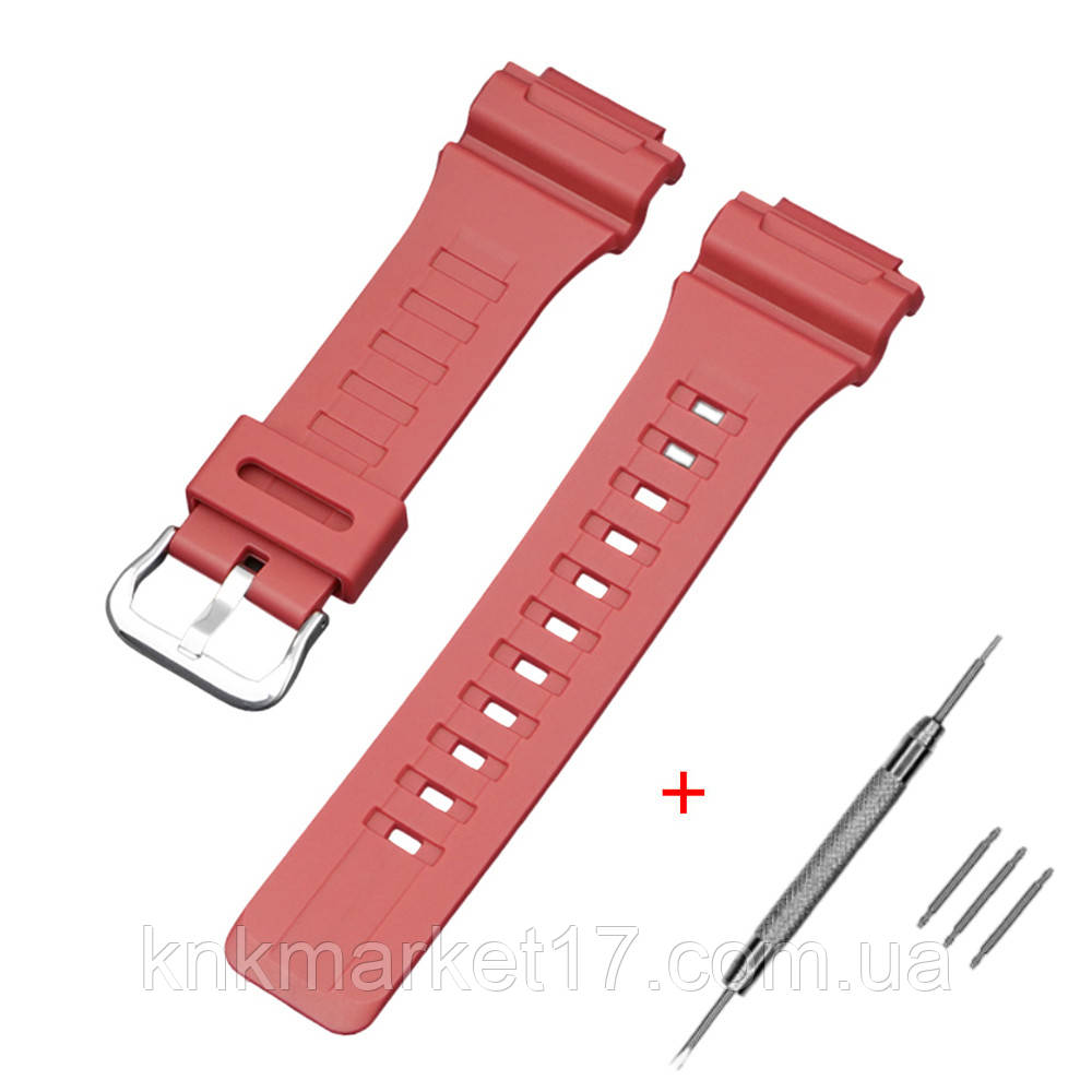 Ремінець для годинника Casio G-Shock AQ-S800W/S810W, W-215/216H/S200H/735H/800H, SGW-300H/400H/500H, AE-1000W виготовлений із поліуретану, має червоний. Довжина ремінця становить 21,5 см, ширина — 18 мм. Застібка сріблястого кольору обладнана пряжкою. Ремінець підходить для чоловічих, жіночих та унісекс-моделі годин. Произведено в Китае. Гарантія — 1 місяць. Вага ремінця становить 23 г.
